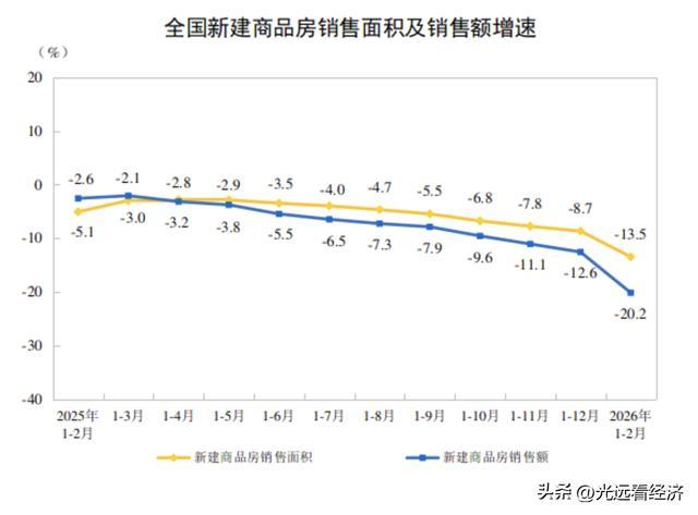 比如房地产的销售,我们看到同比房地产的销售面积下降13.5%,销售额下降超20%,让人感觉是不是又加速下滑了?其实没有,为什么?因为这个数据是相对于去年同期的,也就是相对于2025年前两个月的高基数。所以当我们把同比跟环比揉到一块看的时候,会发现过去一年市场明显下行,但单月环比看,2月销售降幅较12月明显收窄,成交边际改善。